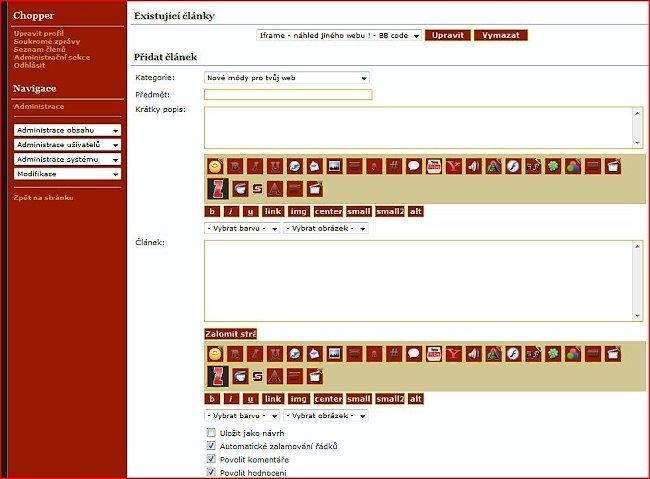 Jak postupovat a zapnout vkládání BB codes do článků a novinek. Jelikož vkládání BB kódu je specifické