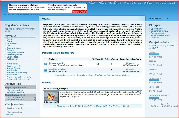 Připravili jsme pro vás tyto stránky,kde si můžete vytvořit svůj vlastní web úplně zadarmo. Pokud jsi uživatel,který neumí instalovat webové stránky, neumí nastavovat přístupy, chmod, upravovat design a chce jen pomocí ikonek ovládat svůj web jsi tu správně. Právě takovýto systém je tento web,kde si můžeš vytvořit své stránky a to zdarma. Nepotřebuješ vědět nic o aktualizacích, vylepšování webu, hostingu,vše řešíme za tebe. Ty si můžeš vybrat s mnoha designů webu, úprav webu,vše je v jedné instalaci.O aktualizace se staráme my,včetně hostingu, nových MÓDŮ, vylepšení atd. Ty si můžeš vytvořit svůj vlastní web s tvým názvem a provozovat ho úplně zdarma. A pokud si nevíš s něčím rady,prostě napíšeš do podpory a dostaneš odpověď na svůj problém s webovými stránkami. Líbí se ti takový přístup?? Tak neváhej a registruj si svůj vlastní web.Pro registraci si můžeš vybrat domény megabajt.cz, kilobajt.cz, coolstranky.cz (připravuje se megabajt.sk)