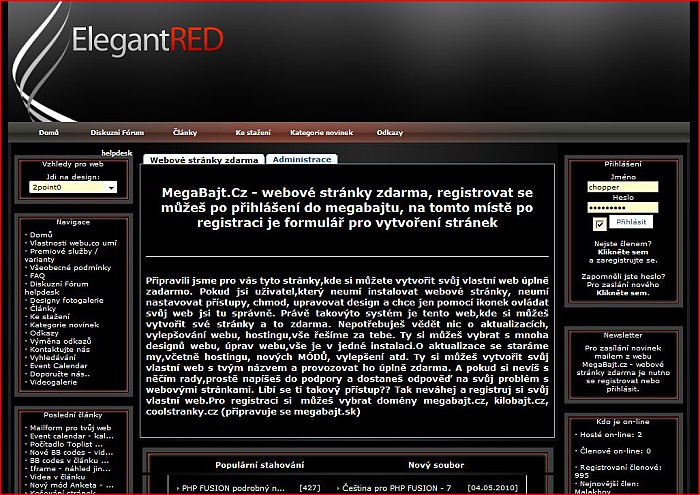 Připravili jsme pro vás tyto stránky,kde si můžete vytvořit svůj vlastní web úplně zadarmo. Pokud jsi uživatel,který neumí instalovat webové stránky, neumí nastavovat přístupy, chmod, upravovat design a chce jen pomocí ikonek ovládat svůj web jsi tu správně. Právě takovýto systém je tento web,kde si můžeš vytvořit své stránky a to zdarma. Nepotřebuješ vědět nic o aktualizacích, vylepšování webu, hostingu,vše řešíme za tebe. Ty si můžeš vybrat s mnoha designů webu, úprav webu,vše je v jedné instalaci.O aktualizace se staráme my,včetně hostingu, nových MÓDŮ, vylepšení atd. Ty si můžeš vytvořit svůj vlastní web s tvým názvem a provozovat ho úplně zdarma. A pokud si nevíš s něčím rady,prostě napíšeš do podpory a dostaneš odpověď na svůj problém s webovými stránkami. Líbí se ti takový přístup?? Tak neváhej a registruj si svůj vlastní web.Pro registraci si můžeš vybrat domény megabajt.cz, kilobajt.cz, coolstranky.cz (připravuje se megabajt.sk)