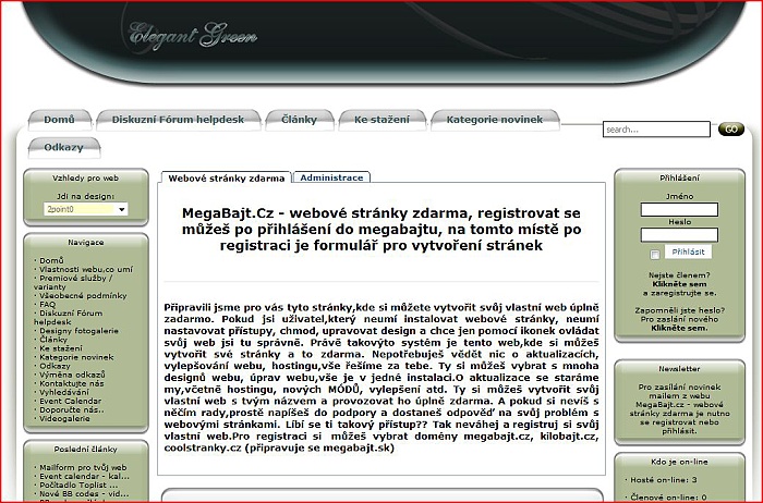 Připravili jsme pro vás tyto stránky,kde si můžete vytvořit svůj vlastní web úplně zadarmo. Pokud jsi uživatel,který neumí instalovat webové stránky, neumí nastavovat přístupy, chmod, upravovat design a chce jen pomocí ikonek ovládat svůj web jsi tu správně. Právě takovýto systém je tento web,kde si můžeš vytvořit své stránky a to zdarma. Nepotřebuješ vědět nic o aktualizacích, vylepšování webu, hostingu,vše řešíme za tebe. Ty si můžeš vybrat s mnoha designů webu, úprav webu,vše je v jedné instalaci.O aktualizace se staráme my,včetně hostingu, nových MÓDŮ, vylepšení atd. Ty si můžeš vytvořit svůj vlastní web s tvým názvem a provozovat ho úplně zdarma. A pokud si nevíš s něčím rady,prostě napíšeš do podpory a dostaneš odpověď na svůj problém s webovými stránkami. Líbí se ti takový přístup?? Tak neváhej a registruj si svůj vlastní web.Pro registraci si můžeš vybrat domény megabajt.cz, kilobajt.cz, coolstranky.cz (připravuje se megabajt.sk)